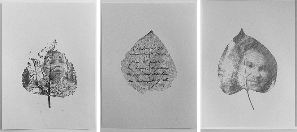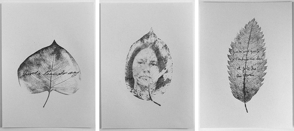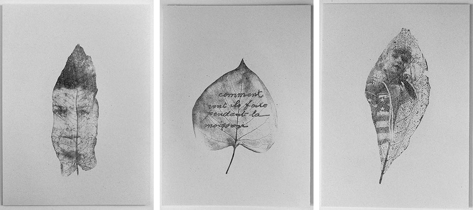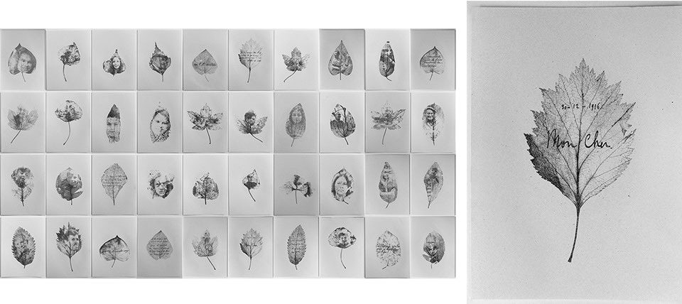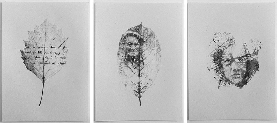 Sketches of the series "Les soupirants" and "Chemin sur feuille d'être" - drawing, transfer printing, rubbing - texts from World War I correspondences