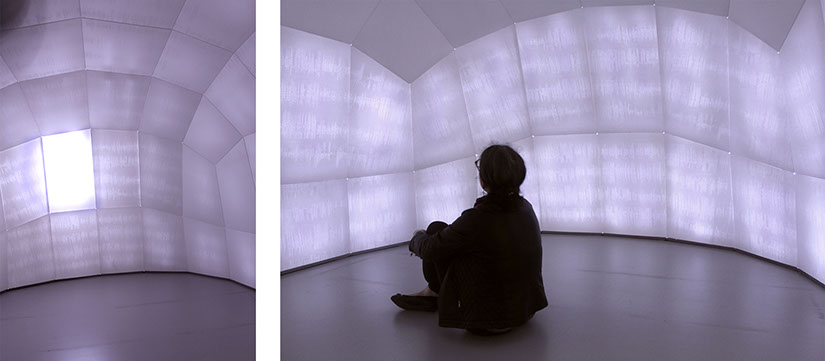 2015, h : 2,30m / L : 3,2m / l : 3,13m, Ecouter l’ombre - espace voûté recouvert de papier millimétré percé de sonogrammes, système lumineux programmé en fonction de la bande sonore -