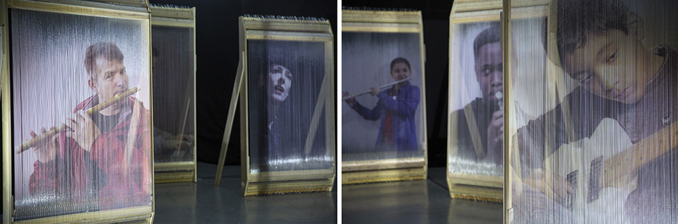 Une bande sonore composée d’enregistrements réalisés lors des différentes rencontres est à l’origine d’un programme informatique qui déclenche de façon intermittente un système mécanique. Des dizaine de petits marteaux de bois font vibrer une partie ou la totalité des fils. Un filet de voix, un accord de guitare ... brisent la régularité de la trame, brouille la vue. Certaines parties des portraits tremblent. Puis les fils reviennent à leur état d’origine.