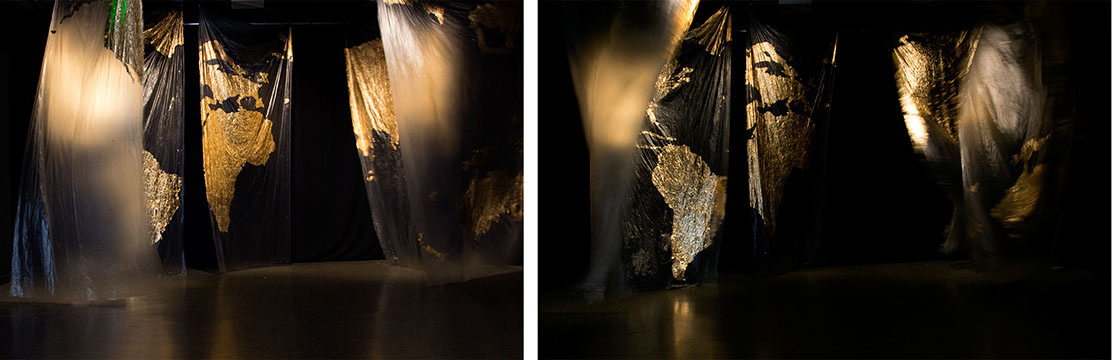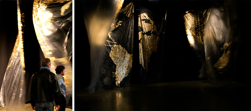 2014, Installation sonore - Bâches plastiques recouvertes de feuilles d'or, moteurs, haut-parleurs, amplificateurs - dimensions variables