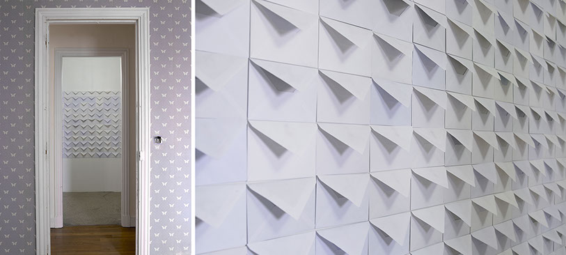 This interactive sound installation is composed of a hundred of white envelopes. As the visitor approaches the wall and lifts the envelope's flaps, he or she may hear sms messages read outloud by a mechanic voice.