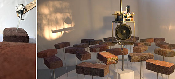 Un stylet est fixé sur chaque enceinte. Celle-ci transmet l’onde sonore au stylet. Et c’est le son qui commande le mouvement de gravure et d’écriture sur la brique.