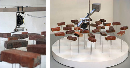 2010, Socle 2 m diamètre / hauteur 1,45 m - 32 briques récoltées dans 3 quartiers en mutation de l'agglomération lilloise, moteur, bras mécanique, lecteur audio, amplificateur, haut-parleur et système d'écriture -