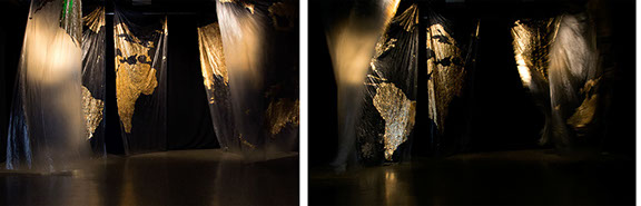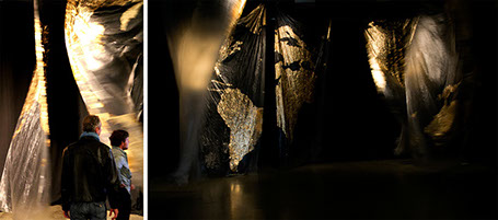2014, Installation sonore - Bâches plastiques, feuilles d'or, moteurs, haut-parleurs, amplificateurs - dimensions variables