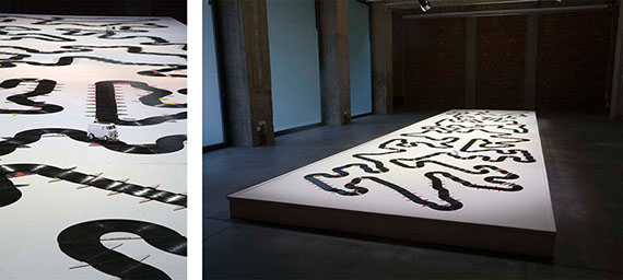 The lines sink into black areas, draw paths. Each circuit is driven over by a vehicle equipped with a sapphire needle that restores the sound contained in the vinyl grooves... Vehicles move from one fragment of a record to another , jump from one path to another, accelerate or slow down depending on the luminous intensity of the areas they pass through.