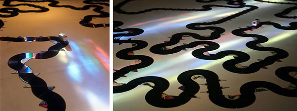 Hundreds of vinyl records have been cut and placed side by side, thus creating two sinuous lines: two circuits. Each circuit has been designed to be symmetrical to the other: half of the first disc in the first circuit, the other half in the second, or the A side in the first circuit and the B side in the second.