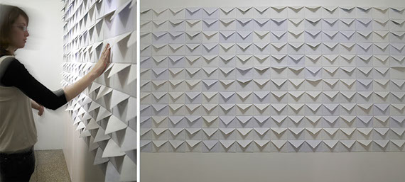This interactive sound installation is composed of a hundred of white envelopes. As the visitor approaches the wall and lifts the envelope's flaps, he or she may hear sms messages read outloud by a mechanic voice.