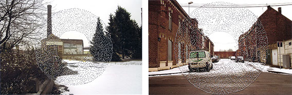 Extracts from "construction narratives" are engraved on the photographs of the places explored during the création of the work Boustrophédon.