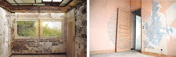 Des extraits de "récits de construction" sont gravés sur les photographies des lieux explorés lors la création de Boustrophédon.