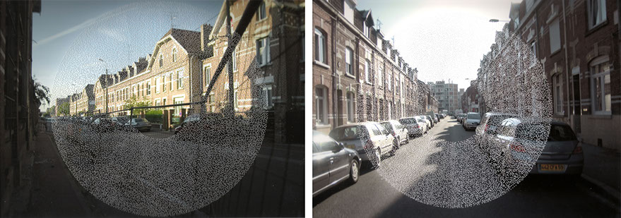 Des extraits de "récits de construction" sont gravés sur les photographies des lieux explorés lors la création de Boustrophédon.