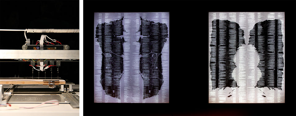 Cinq aiguilles sont fixées à l’élément surplombant. Elles descendent, piquent, se lèvent tour à tour, et selon des rythmes différents, percent la surface de papier de milliers de trous de quelques millimètres de diamètre. Les paroles émises dans l’installation «Les Tournants» ont été traduites en code binaire. Ce code commande l’impulsion des aiguilles. Il est l’empreinte d’une voix, d’un récit. Lentement les aiguilles marquent la surface du papier. Elles donnent à voir des séquences parlées et rendent visibles des signaux acoustiques (des amplitudes, des attaques, une enveloppe sonore, des fréquences, des phonèmes, des consonnes). Dans le même temps, elles vident le papier d’une partie de sa matière. Il faut approximativement six heures à l’appareil pour graver une séquence entière. Le spectateur n’assiste qu’à une part de ce long travail. Doucement, le papier se fragilise, devient dentelle.
