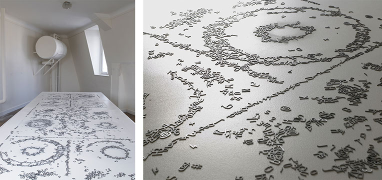 Les caractères tourbillonnent, se croisent, se repoussent, s’attirent. Ils tracent des lignes, se regroupent, un dessin semble se créer, celui d’un plan d’une ville imaginaire, d’une carte météorologique, d’un réseau téléphonique, ou d’une vue microscopique.