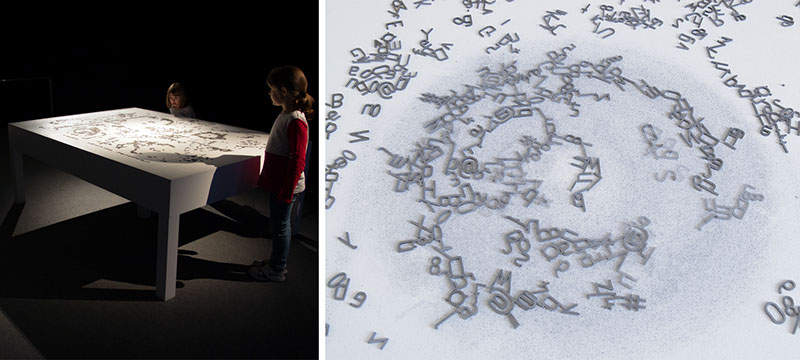This sound installation is composed of hundreds of tiny metal letters placed on a table guided randomly by a complex machinerie of magnets.