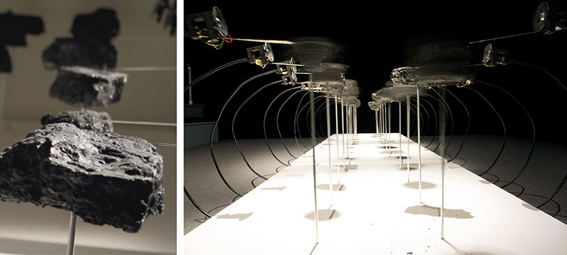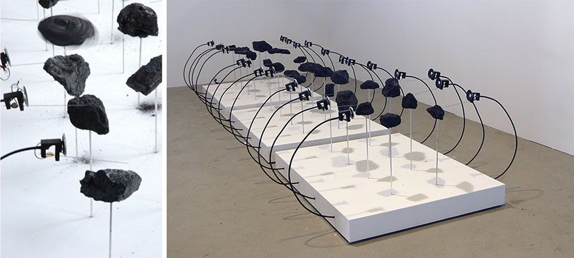 2009- Morceaux de charbon reposant sur des moteurs tournant à 33 tours minutes, aiguilles métalliques, piezzos céramiques, amplificateurs sonores, haut parleurs, flexibles métalliques - dimensions variables