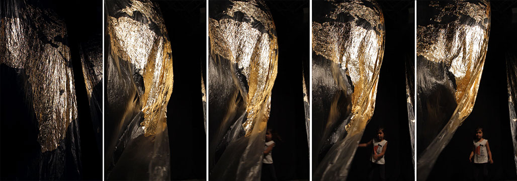 2014, Installation sonore - Bâches plastiques recouvertes de feuilles d'or, moteurs, haut-parleurs, amplificateurs - dimensions variables