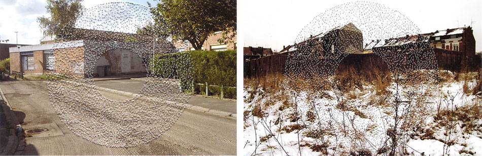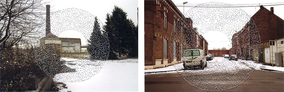 Des extraits de "récits de construction" sont gravés sur les photographies des lieux explorés lors la création de Boustrophédon.