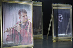 Sound installation, digital print on nylon thread, percussion mechanical system, 4 loudspeakears