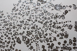 Sound installation - Pieces of coal situated on engines that rotate at the speed of 33 turns per minute, metal needels, piezoceramics, loudspeakers, audio amplifiers, metal hoses - size in situ