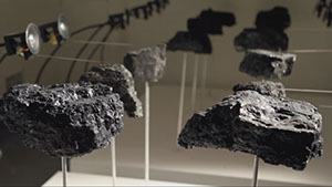 Installation sonore - Morceaux de charbon reposant sur des moteurs tournant à 33 tours minutes, aiguilles métalliques, piezzos céramiques, amplificateurs sonores, haut parleurs, flexibles métalliques - dimensions variables