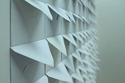 Sound installation - vaulted space covered with squared sheets of paper pierced with a sonogram, light system program according to the soundtrack - 2,30m / L : 3,2m / l : 3,13m