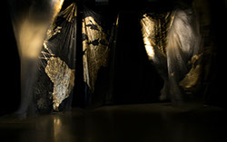Installation sonore - Bâches plastiques recouvertes de feuilles d'or, moteurs, haut-parleurs, amplificateurs sonores - dimensions variables
